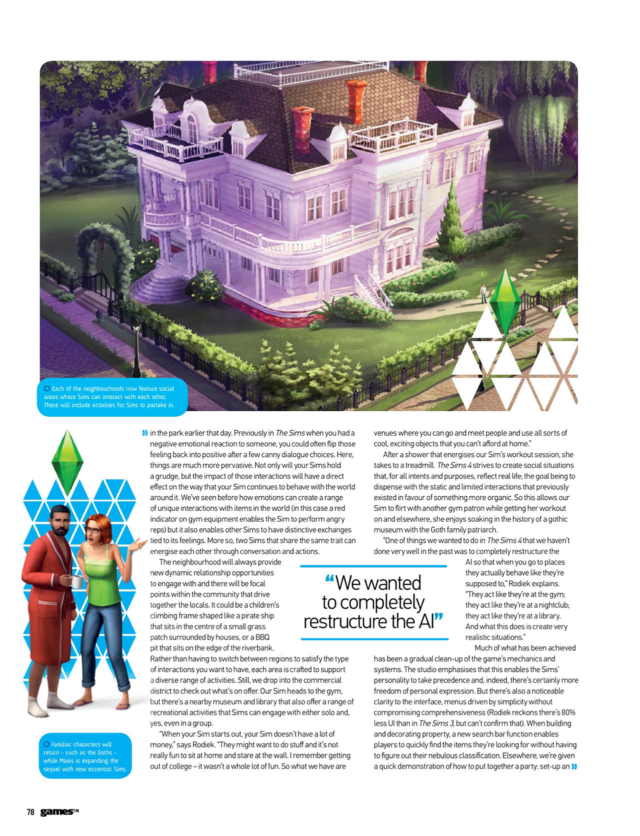 “One of [the] things we wanted to do in The Sims 4 that we haven’t done very well in the past was to completely restructure the AI so that when you go to places they actually behave like they’re supposed to,” Rodiek explains. “They act like they’re at the gym; they act like they’re at a nightclub; they act like they’re at a library. And what this does is create very realistic situations.”